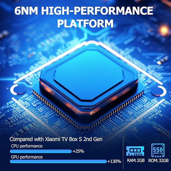 The TV box is powered by a 64-bit quad-core A55 CPU built on a 6nm process, with a clock speed of up to 2.5GHz. Combined with 2GB of RAM and 32GB of storage, it offers smooth and responsive performance. Compared to its predecessor, the CPU performance is up by 25% and GPU performance by 130%.
